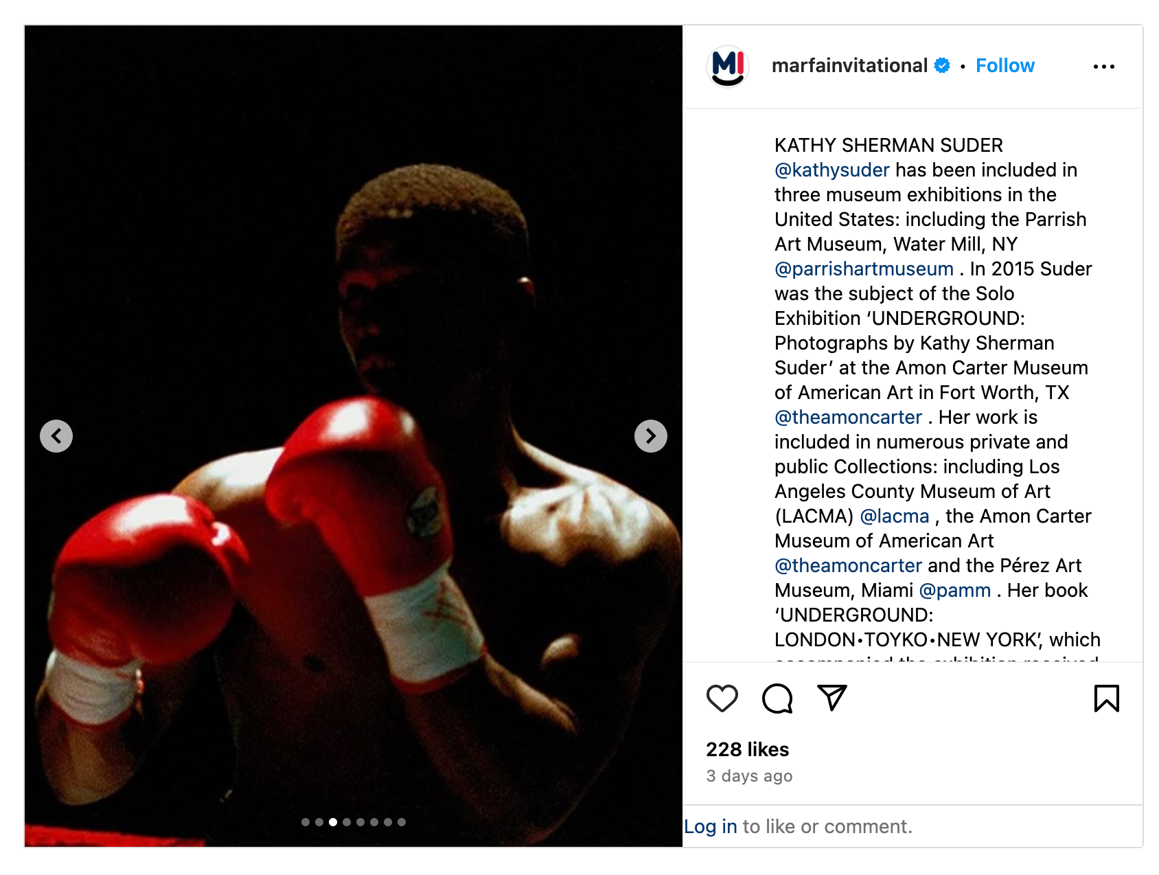 Kathy Sherman Suder’s first major series of work on boxers, KNOCKOUT, as described by The New Yorker, “owe more to Caravaggio than to Sports Illustrated” debuted in New York and marked Suder’s arrival on the U.S. art scene as an image maker of unusual emotional and visual power. The artist’s first U.S. solo museum exhibition, UNDERGROUND: Photographs by Kathy Sherman Suder was curated by John Rohrbach and opened at the Amon Carter Museum of American Art in 2014 with accompanying catalog, which won awards and accolades. Her most recent installation of 100 illuminated tents and photographic works showing the face of homelessness at the Bombay Beach Biennale was reviewed in the New York Times and Los Angeles Times Magazine. Photographs by Suder have been acquired for the permanent collections of the Los Angeles County Museum of Art (LACMA), Amon Carter Museum of American Art and the Pérez Art Museum Miami.